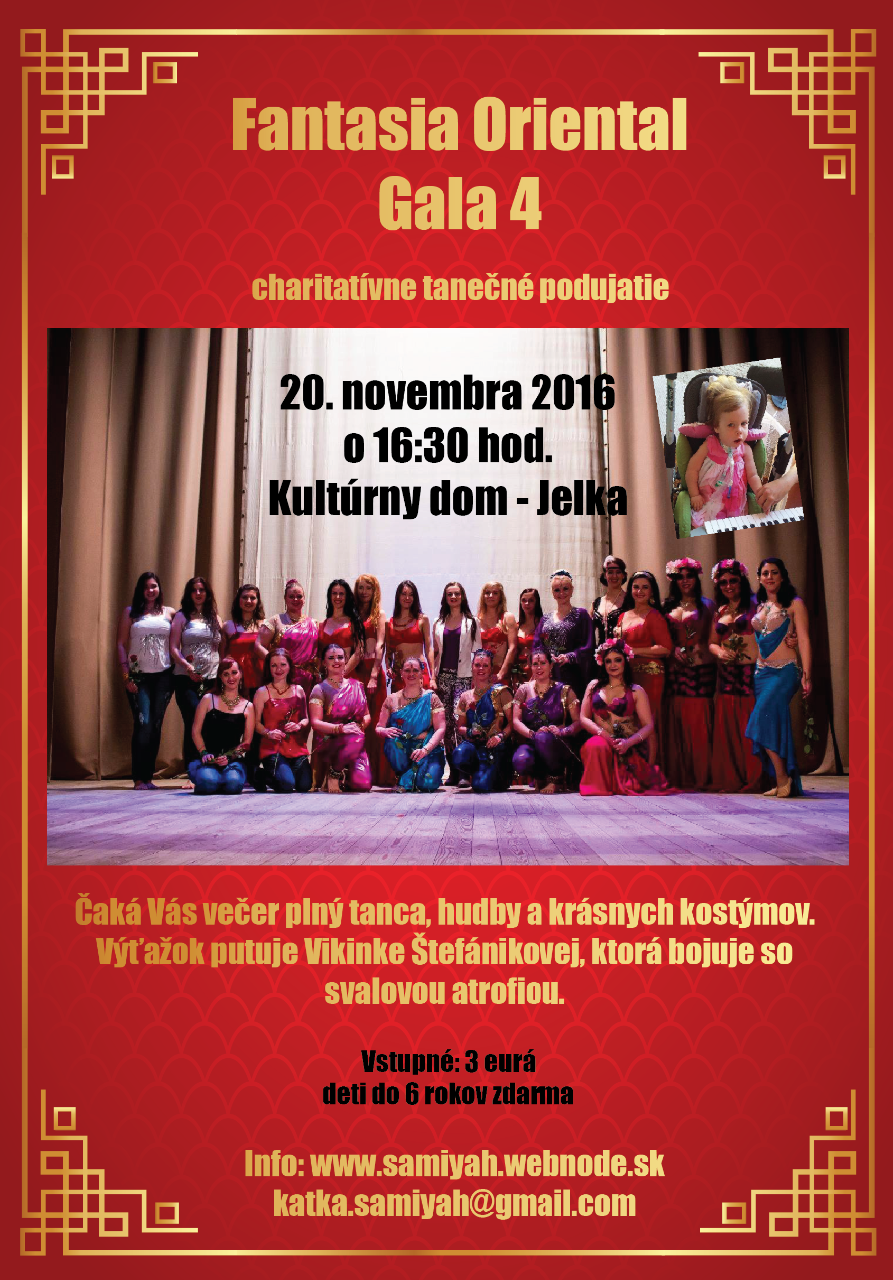 17.09.2016 00:58Už teraz sa môžete tešiť na 4. tanečnú show Fantasia Oriental Gala v Jelke, ktorá aj tentokrát bude výnimočná, neopakovateľná, miestami prekvapujúca a opäť charitatívna =) Viac tu Fantasia Oriental Gala